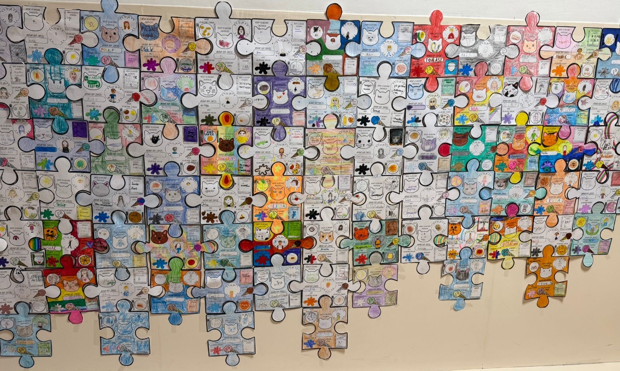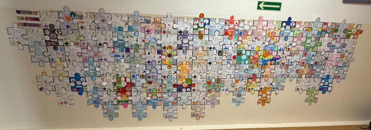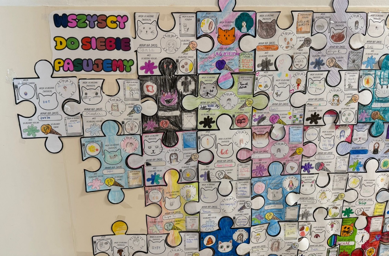 Podczas zajęć uczniowie przygotowali puzzle o sobie – przedstawili swoje zainteresowania, ulubione smaki, książki, kolory i zwierzęta. Z połączonych prac powstało wyjątkowe wspólne dzieło pod hasłem: „Wszyscy do siebie pasujemy”. 🧩