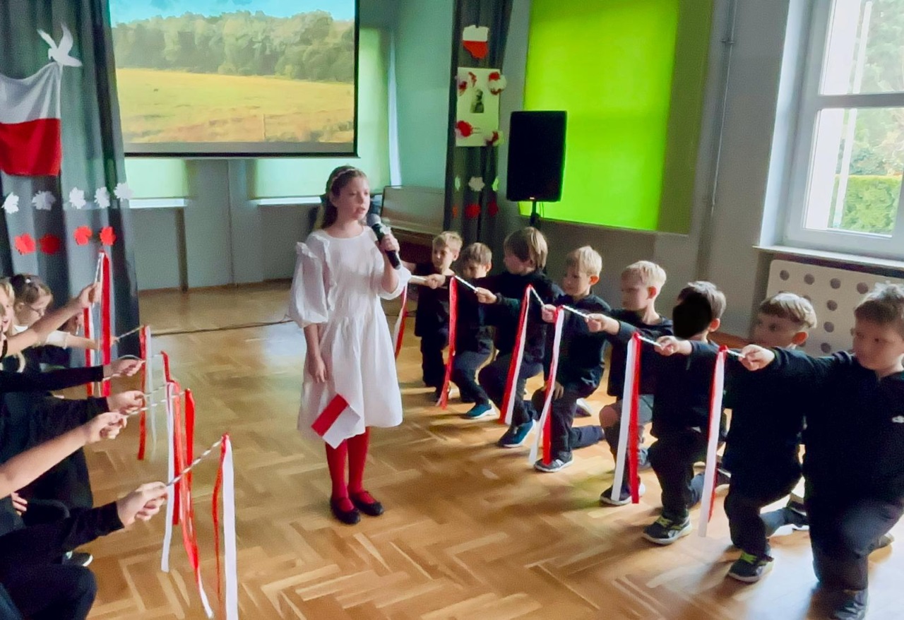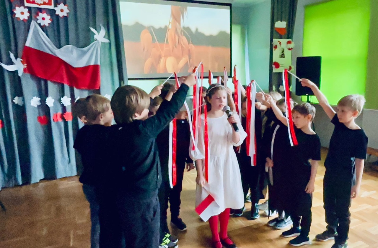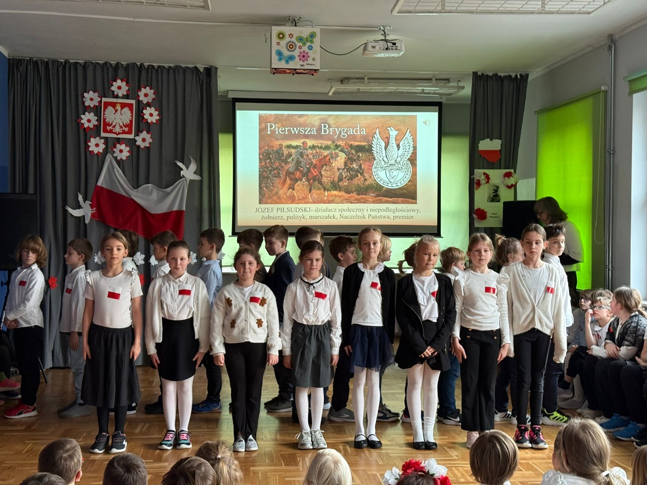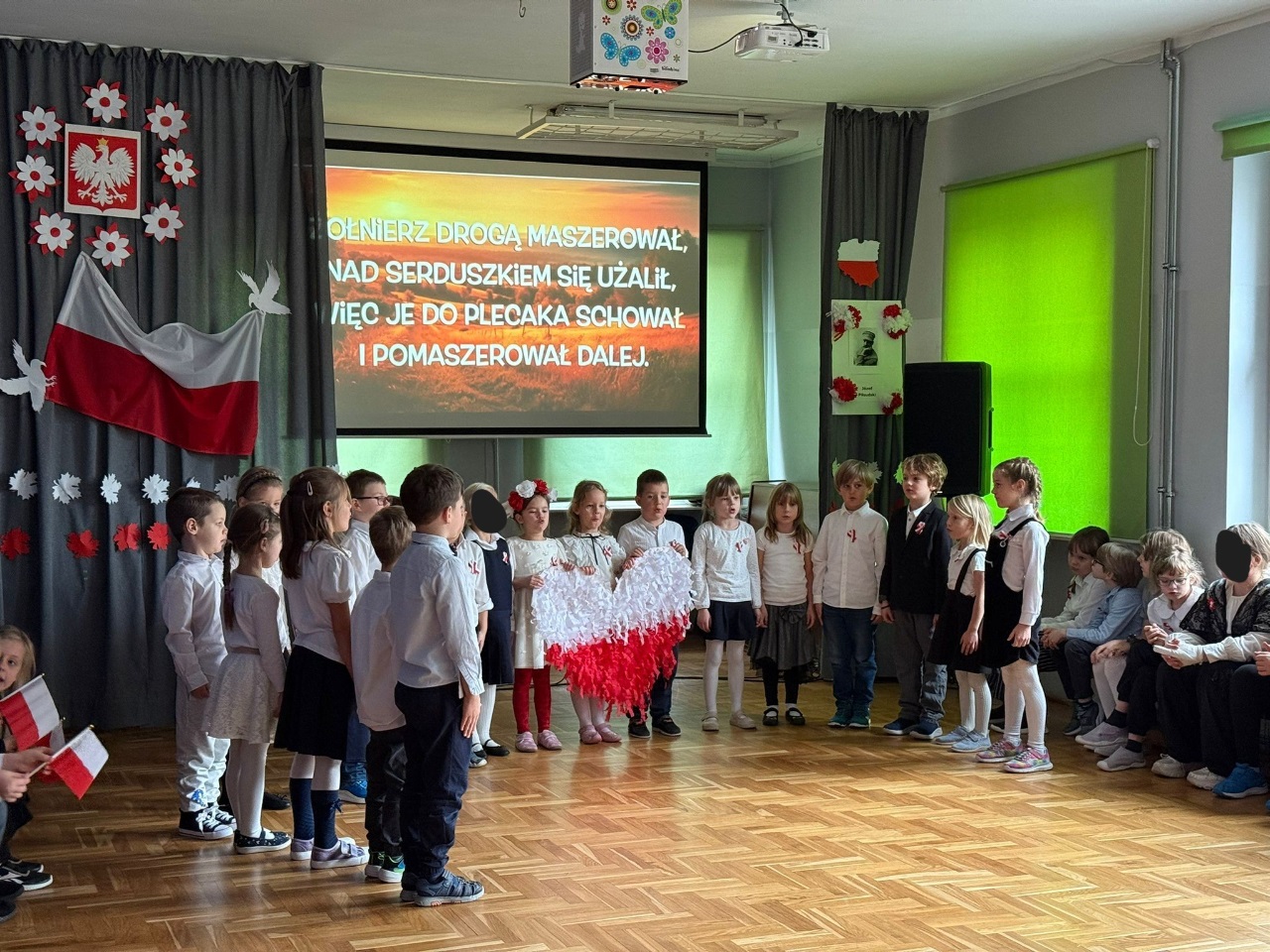 W listopadzie tradycyjnie uczniowie klas I-III oraz dzieci z oddziału przedszkolnego wzięły udział w niezwykłej lekcji historii na temat walki Polaków o niepodległość. Pierwsza część spotkania poświęcona była historii Polski związanej z okresem zaborów, I wojny światowej oraz obchodami Narodowego Święta Niepodległości. Dzieci z dumą zaśpiewały „Mazurek Dąbrowskiego” i recytowały „Katechizm dziecka polskiego” (kl. I a). W marszowym rytmie zabrzmiały w ustach małych artystów takie pieśni jak: „Szara piechota” (kl. I b) „Marsz Pierwszej Brygady” ( kl. III b i II b) oraz „Wojenko, wojenko” (kl. I c).