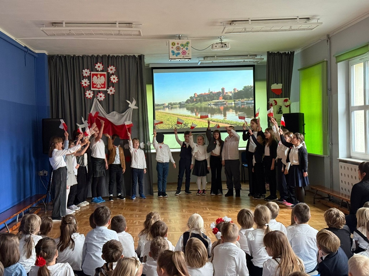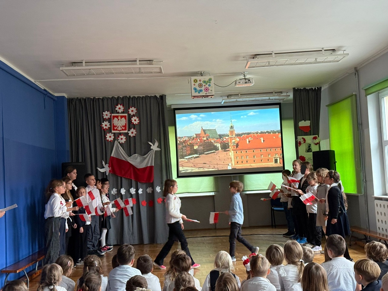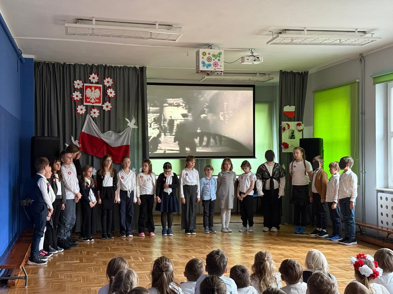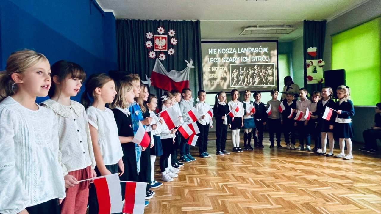 W listopadzie tradycyjnie uczniowie klas I-III oraz dzieci z oddziału przedszkolnego wzięły udział w niezwykłej lekcji historii na temat walki Polaków o niepodległość. Pierwsza część spotkania poświęcona była historii Polski związanej z okresem zaborów, I wojny światowej oraz obchodami Narodowego Święta Niepodległości. Dzieci z dumą zaśpiewały „Mazurek Dąbrowskiego” i recytowały „Katechizm dziecka polskiego” (kl. I a). W marszowym rytmie zabrzmiały w ustach małych artystów takie pieśni jak: „Szara piechota” (kl. I b) „Marsz Pierwszej Brygady” ( kl. III b i II b) oraz „Wojenko, wojenko” (kl. I c).