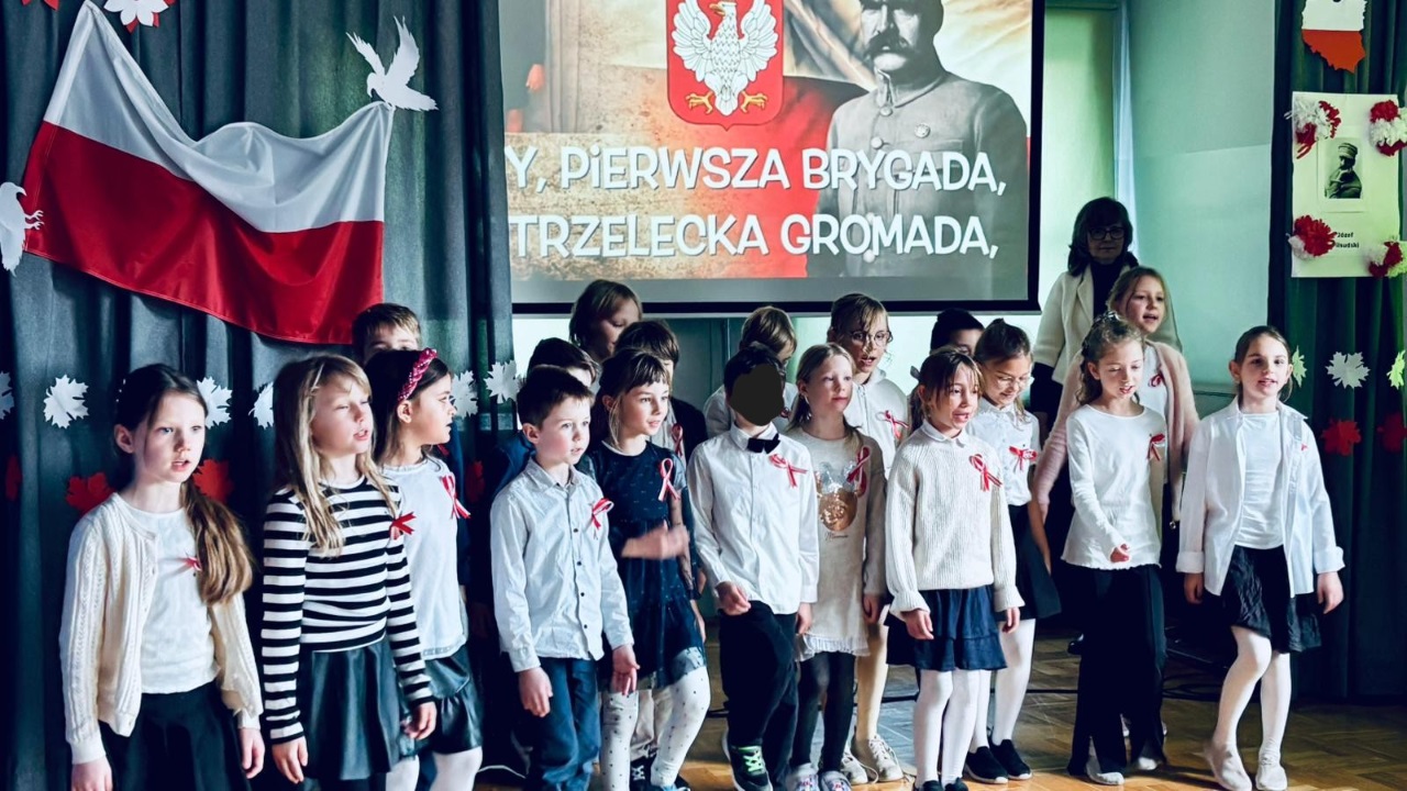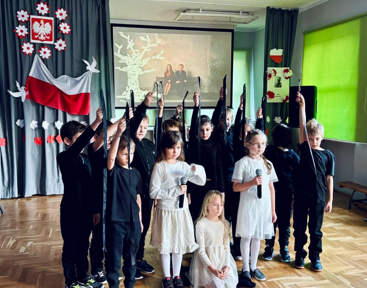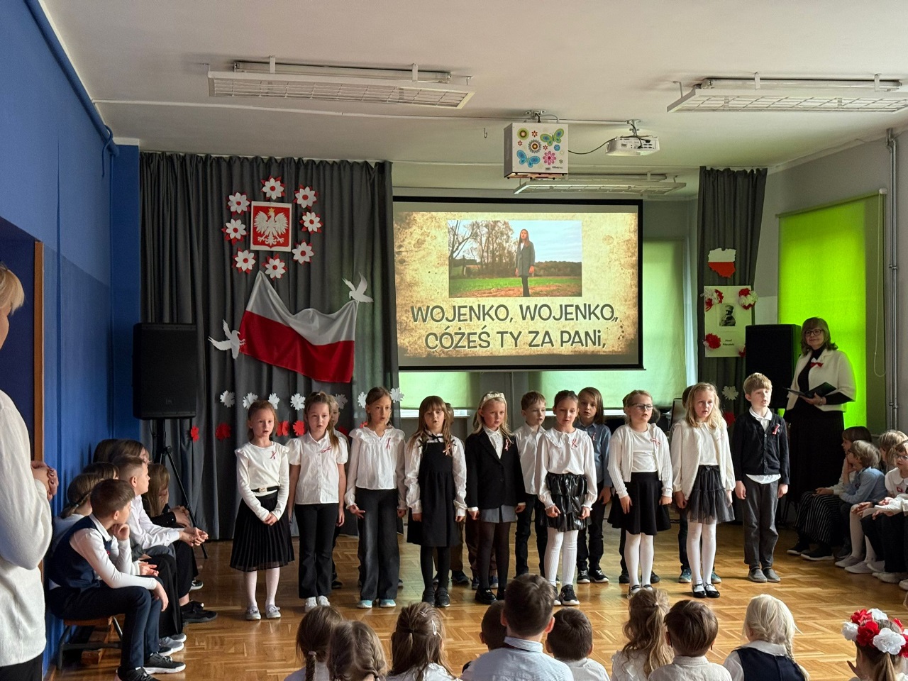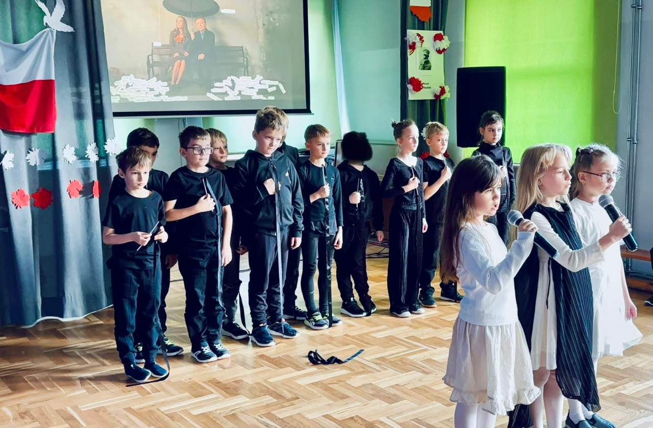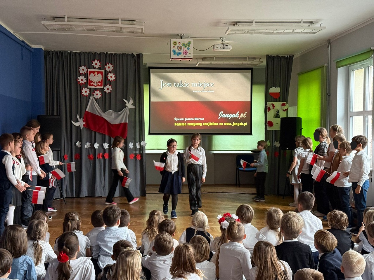 W listopadzie tradycyjnie uczniowie klas I-III oraz dzieci z oddziału przedszkolnego wzięły udział w niezwykłej lekcji historii na temat walki Polaków o niepodległość. Pierwsza część spotkania poświęcona była historii Polski związanej z okresem zaborów, I wojny światowej oraz obchodami Narodowego Święta Niepodległości. Dzieci z dumą zaśpiewały „Mazurek Dąbrowskiego” i recytowały „Katechizm dziecka polskiego” (kl. I a). W marszowym rytmie zabrzmiały w ustach małych artystów takie pieśni jak: „Szara piechota” (kl. I b) „Marsz Pierwszej Brygady” ( kl. III b i II b) oraz „Wojenko, wojenko” (kl. I c).