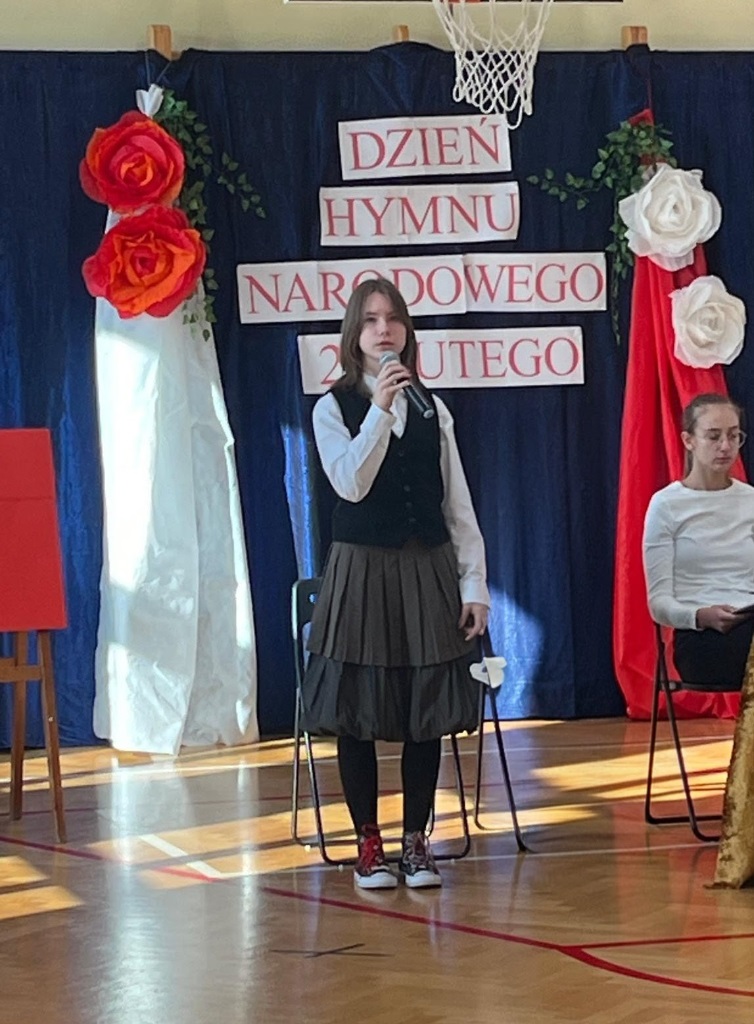 Dalszą część apelu poświęcono ważnym pieśniom narodowym. Utwory: „Boże, coś Polskę”, „Rota”, „My, Pierwsza Brygada” oraz „Warszawianka” w różnych momentach historii pretendowały do roli hymnu narodowego i cieszyły się ogromnym poparciem społecznym. Informacje dotyczące tych pieśni przybliżyły uczennice klasy 8b – Emilia Zdrojewska, Nina Skrzydłowska oraz Oliwia Lechowska. Dzięki ich wystąpieniu mogliśmy lepiej zrozumieć historyczne okoliczności powstania tych utworów oraz ich rolę w podtrzymywaniu ducha narodu w trudnych momentach dziejów.