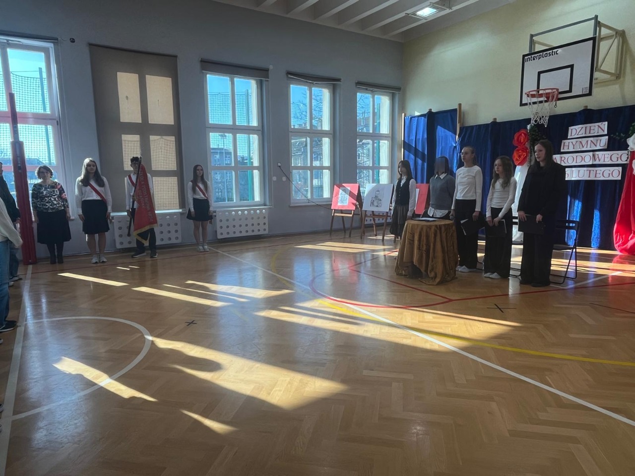 Uroczystość rodbyłała się, dzięki gościnności Katedry Wychowania Fizycznego, na dużej sali gimnastycznej, gdzie gości przywitała Przewodnicząca Samorządu Uczniowskiego - Natalia Szczepańska, która podkreśliła rangę wydarzenia oraz znaczenie symboli narodowych w życiu każdego Polaka.