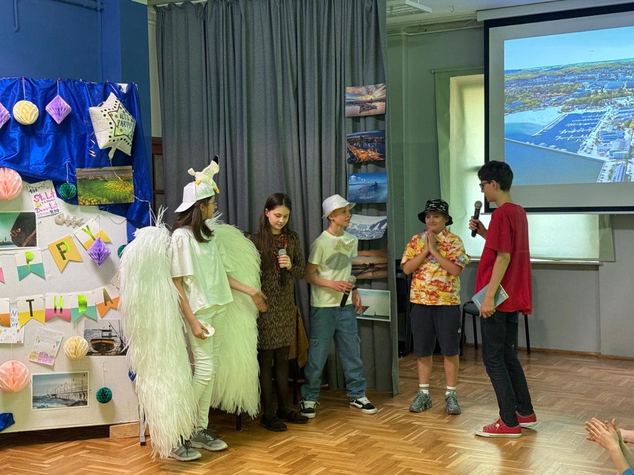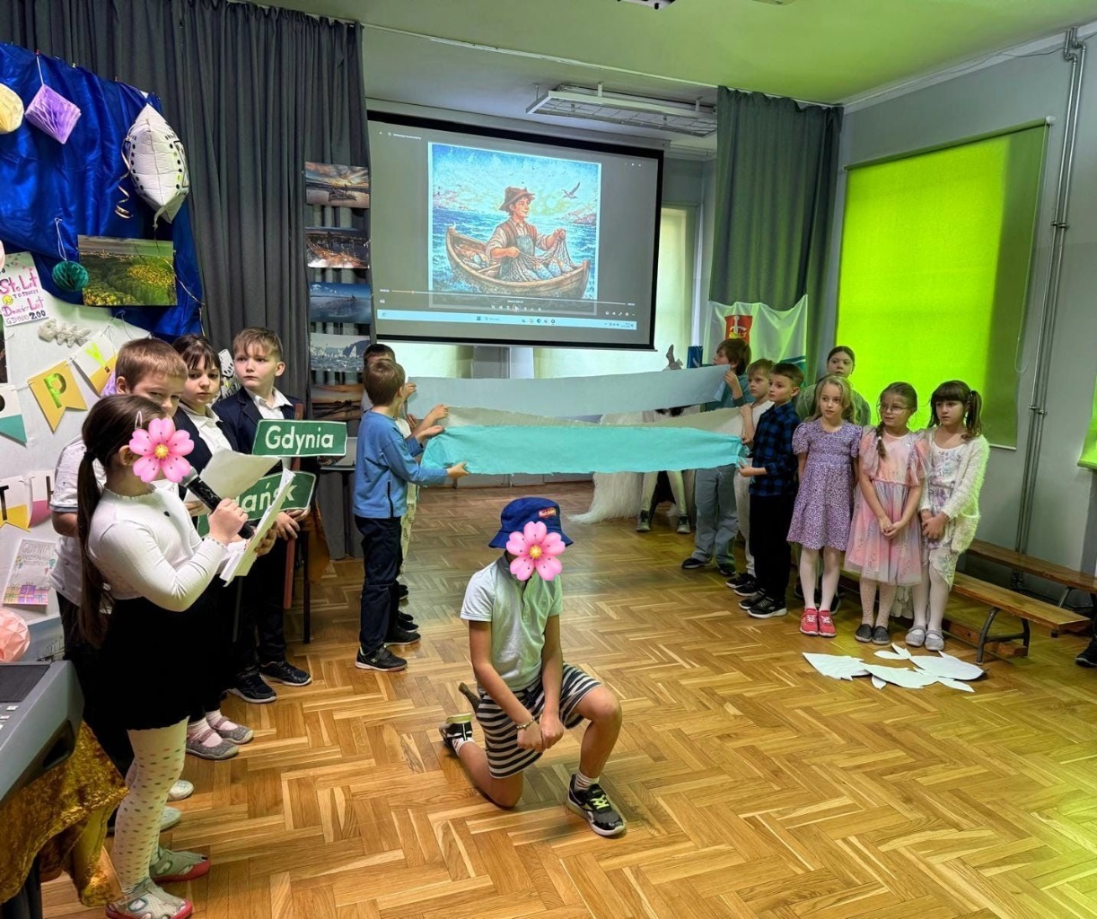 Występ klasy V a (p. A. Kosko- Hołowczyc i p. D. Rutkowskiej) w autorskim spektaklu "Jubilatka- nasza sąsiadka" w zabawny sposób przedstawił Widzom symbole Gdyni i jej szanownych sąsiadów, czyli Gdańsk i Sopot. Spory pomiędzy Mewą, Bursztynką, Bałtyckim Śledziem, Gdańskiem i Sopotem, o to, kto jest ważniejszym gościem na urodzinowej imprezie, i kto piękniejszy podarek przyniósł dla Jubilatki - rozstrzygnęła Tajemnicza Postać, symbolizująca PAMIĘĆ. Dzięki muszli, którą miała ze sobą, nasi Bohaterowie usłyszeli odgłosy gdyńskich dziejów, docenili wagę wspomnień. Zrozumieli, że w świecie, który tak pędzi, najcenniejszym prezentem i luksusem stają się czyjaś życzliwa obecność i prawdziwa relacja.