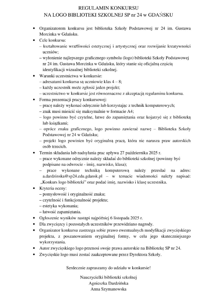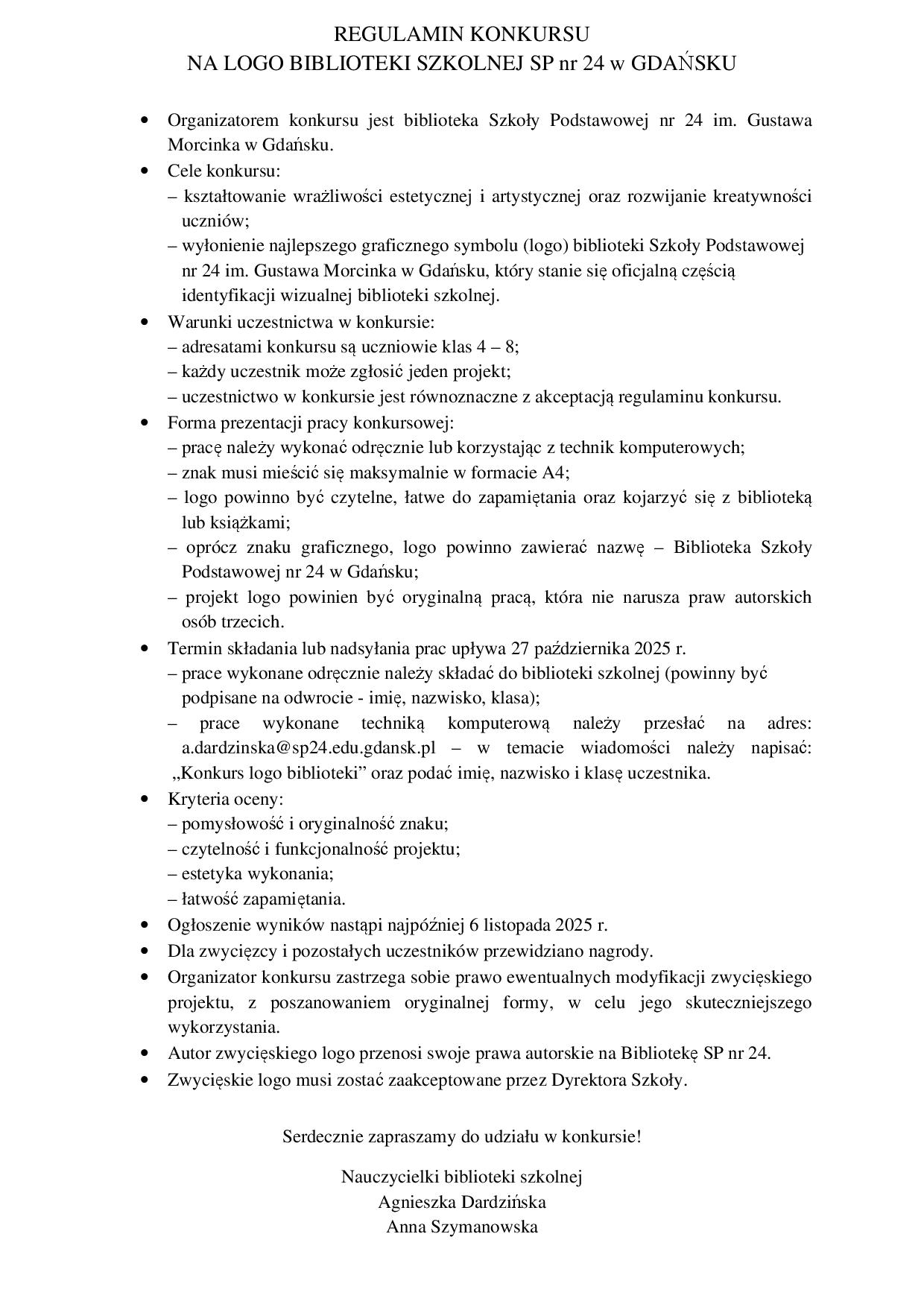 REGULAMIN KONKURSU NA LOGO BIBLIOTEKI SZKOLNEJ - Szkoła Podstawowa nr 24 im. Gustawa Morcinka