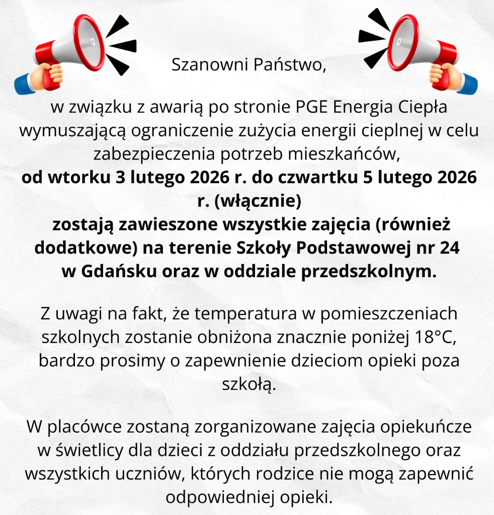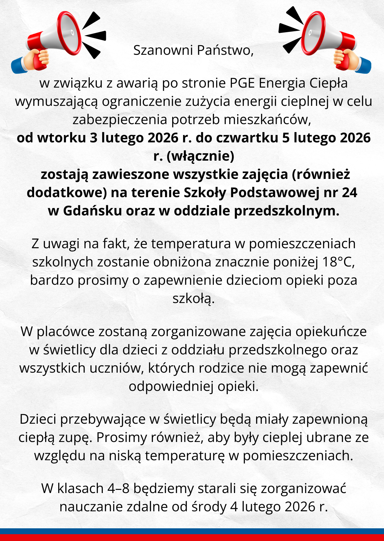 ZAWIESZENIE ZAJĘĆ W DNIACH 03.02.2026-05.02.2026 - Szkoła Podstawowa nr 24 im. Gustawa Morcinka